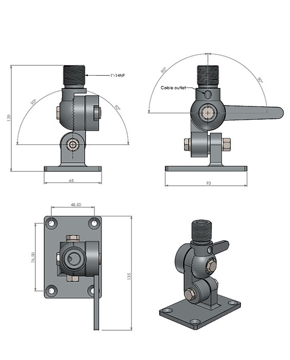 Description: This is a four way ratchet mount for installation of antennas with US-style internal 1″-14NF threaded base on deck etc.